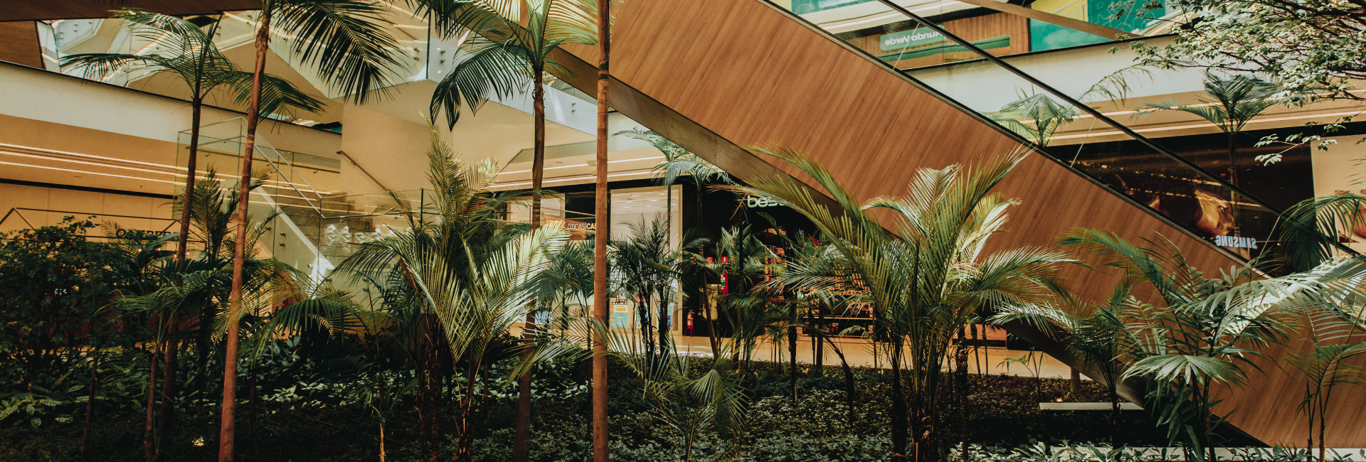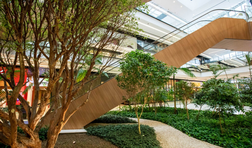 Além disso, em todos os pisos do shopping, o mobiliário com peças exclusivas, de madeira maciça e certificada, ressalta como a destinação adequada e sustentável de troncos vegetais pode resultar em peças decorativas e confortáveis, respeitando a natureza.